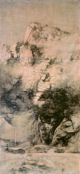 面對(duì)這一課題,藝術(shù)家曹吉岡想到了從中國(guó)傳統(tǒng)山水畫中尋找答案。他的諸多坦培拉作品從造型到筆觸都高度融合了中國(guó)山水畫技法。如在創(chuàng)作《幽燕古道》(圖③)時(shí),他借鑒水墨暈染的技法將山石等景致進(jìn)行虛化處理,以求空靈的意境;而在《秋山靜月》的創(chuàng)作中,大量流淌、飛濺的墨痕,則彰顯出中國(guó)水墨獨(dú)有的寫意氣韻。