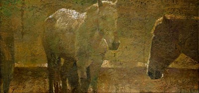 藝術(shù)家李曉剛的創(chuàng)作便是典型的案例,他以較為小眾的“酪素坦培拉”作為主要?jiǎng)?chuàng)作媒介,形成了獨(dú)特的畫面效果。干酪素是乳制品中的提取物,將硼砂加入水后再隔水加熱使其充分溶解可制成硼砂溶液,之后將干酪素加入硼砂溶液中攪拌均勻,便可制成酪素乳液。以酪素乳液調(diào)和的顏料具有凹凸不平的顆粒感,適宜營(yíng)造粗獷、斑駁的畫面質(zhì)感。如在《小院》《兩個(gè)鐵皮桶》《兩匹老馬》(圖④)等作品中,李曉剛極具創(chuàng)意地以酪素乳液、雞蛋黃與礦物顏料多層疊加的方式為畫面打底,試圖將“酪素坦培拉”與“雞蛋坦培拉”的材料特性相融合,再用刮刀反復(fù)刮擦畫面形成自然的肌理,不僅保留了坦培拉的柔和質(zhì)感,還賦予作品滄桑之美,傳達(dá)出神秘、悠遠(yuǎn)的意境。