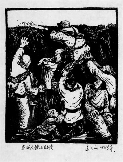 發展到后期,抗戰版畫作品則呈現出更豐富的維度與更深刻的內涵。例如彥涵1943年的《當敵人搜山時候》,以人梯的結構描繪出同仇敵愾的戰斗場景,連一旁的小孩也高舉手榴彈遞上,展現出軍民魚水般的關系,作品敘事生動,極具現場感,蘊含著深刻細膩的精神與情感。