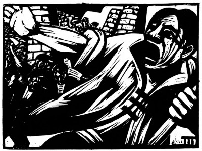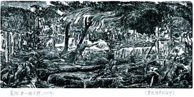 早期作品,如江豐1931年的《要求抗戰者,殺》,常用簡單而高度概括的刀法語言表達宏大悲憤的場景。這種“直刀向木”的創作手法,將表現主義的情感宣泄與抗日的悲憤決心融為一體,刀刃的力度直接轉化為精神的強度,展現出不屈的民族精神。