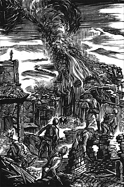 在整個抗戰版畫史中,李樺的《怒吼吧!中國》(1935)極具民族精神的代表性,作者刻畫了一個被繩索捆綁的蒙面男子,他身體扭曲、怒吼抗爭的形象極具沖擊力,雖未直接描繪戰場,卻以“東方雄獅覺醒”的隱喻,成為民族意識覺醒的精神符號。這種象征性創作,將個體的抗爭升華為民族的集體意志,展現出早期抗戰版畫在精神表達上的深刻性。