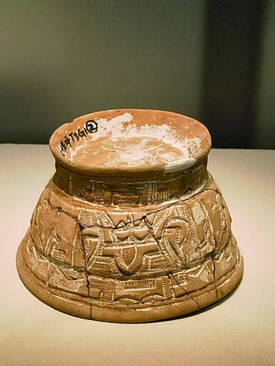 高廟文化的陶杯,腹部飾有四組單尖翹翼鳳鳥和兩組獠牙獸面圖案。光明日報記者李韻攝/光明圖片