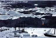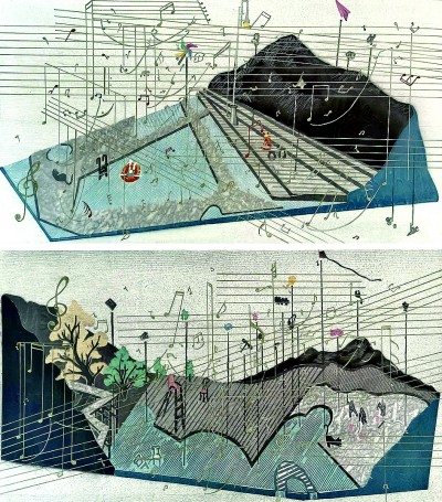 除了對水與色特性的巧妙運(yùn)用,有的藝術(shù)家還另辟蹊徑,借助木板的天然肌理為畫面帶來豐富的質(zhì)感表現(xiàn)。如繪本《飛躍山海》中有多幅表現(xiàn)山水景致的插圖。其中一幅畫面的主要視覺元素為天空、山脈和山間的一座古塔,雖構(gòu)圖簡約,卻呈現(xiàn)出豐富的層次感,只因創(chuàng)作者在質(zhì)感的塑造上下足了功夫。創(chuàng)作之初,藝術(shù)家對多種木材進(jìn)行了對比實(shí)驗(yàn),最終選取了椴木板與水曲柳木板作為刻版材料。在表現(xiàn)天空時(shí),打磨平整的椴木板上的波浪狀肌理被壓印在紙面,若隱若現(xiàn),似水波又似云霧,營造出通透、空靈的意境。而在塑造山脈時(shí),藝術(shù)家則采用水曲柳木板進(jìn)行印制,干澀、鋒利的縱向肌理恰如其分地表現(xiàn)出山脈的險(xiǎn)峻與雄奇。由此,簡單的畫面呈現(xiàn)出質(zhì)樸而深邃的美感,讓觀者從中感受到大自然的鬼斧神工與藝術(shù)家的匠心獨(dú)運(yùn)。