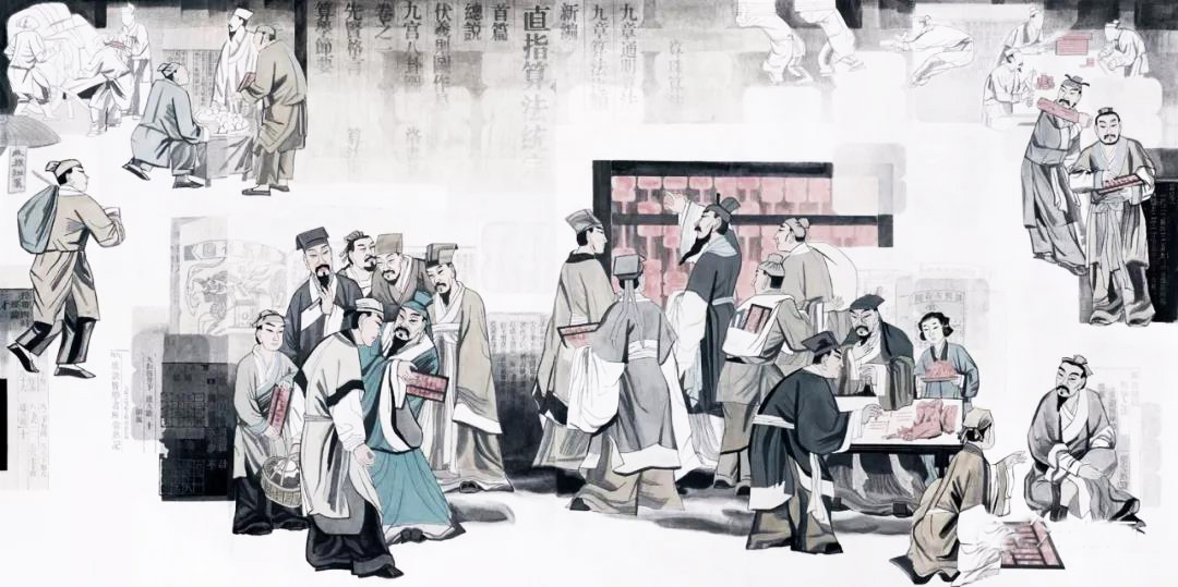 對(duì)古徽派版畫的傳承與創(chuàng)新是我們始終的追求。在創(chuàng)作《算盤與算法統(tǒng)宗》的過程中,我們也將不斷的探索貫穿于創(chuàng)作之中,這也是難以割舍的地域文化優(yōu)勢(shì)和畫家的情愫使然。我們采用水印版畫這種表現(xiàn)方式,為探尋繪畫性的現(xiàn)代精神與語言,形成具有當(dāng)代圖形特征,又有意味的線面形式。借鑒傳統(tǒng)繪畫語素,以輪廓線描為基本造型,在畫面中以線為主的敘亊鋪陳手法,精雕細(xì)鏤的線刻,既保持了古代徽派版畫婉約秀麗的風(fēng)格,又因?yàn)槿宋锞哂袑憣?shí)造型的特征,拉近了傳統(tǒng)水印木刻與現(xiàn)實(shí)視覺體驗(yàn)的表達(dá)距離。在用線上,則大膽追求單純、質(zhì)樸、純凈、素雅,濃淡和肥瘦不同的線,相互交錯(cuò),組成不同的明度和色相的面,使整幅畫表現(xiàn)了線世界的韻律感和水印版畫的美感,形成了鮮明的地域性和獨(dú)特的線刻風(fēng)格,也蘊(yùn)藏了作品獨(dú)特的版畫語言,初步探索和嘗試了對(duì)中國傳統(tǒng)版畫元素和現(xiàn)代圖象特征等形式的傳承和創(chuàng)新。
