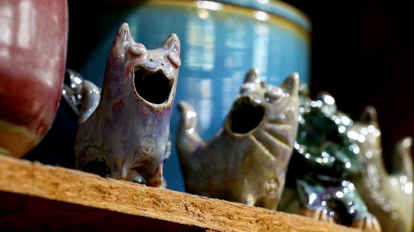 王子強給瓦貓披上了青花釉外衣或者其他鮮艷的釉色,形態上結合家貓的可愛動作和姿態,有的圓潤可愛,有的憨態詼諧,大的可以陳列物品,小的可以捧在手心,受到了年輕人的歡迎。