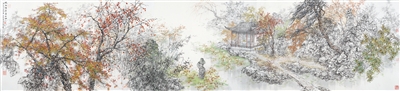 歷時(shí)4年,我完成100多幅園林題材作品。用歐陽修《鑒畫》中的8個(gè)字“蕭條淡泊,閑和嚴(yán)靜”去概括,我在畫文人園林時(shí)想要體現(xiàn)“蕭條淡泊”,繪制皇家園林時(shí)就要體現(xiàn)“閑和嚴(yán)靜”,以此呈現(xiàn)二者不同的氣象。創(chuàng)作中,抓住文人園林和皇家園林不同氣質(zhì)的表達(dá)很重要。歐陽修認(rèn)為立意閑適寧靜、意境深遠(yuǎn)的作品是最難畫的,因?yàn)檫@種心境和意境是難以通過繪畫直觀展現(xiàn)的,需通過含蓄的手法表現(xiàn)深層精神境界。《滿園詩境入畫屏》以諧趣園為對象,皇家園林的恢弘富麗化為具有歷史積淀的紅色立柱,畫面大部分用淡墨呈現(xiàn)湖面、枯荷、遠(yuǎn)景中的亭臺(tái)榭宇和樹石茂林,遠(yuǎn)景所表現(xiàn)的意境將皇家園林固有的廟堂之高帶入雅逸清新、閑和嚴(yán)靜的氣象中。相較而言,《雪映雅堂》從留園五峰仙館內(nèi)望向雪景中的疊石,純墨色立柱與淡墨表現(xiàn)的疊石形成室內(nèi)外的空間對比,疊石上筆墨中的線質(zhì),虛化了疊石的結(jié)構(gòu)與造型,但又著意體現(xiàn)了筆墨細(xì)節(jié),營造出文人園林意蘊(yùn)深遠(yuǎn)與蕭條淡泊的氣質(zhì)。
